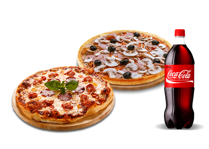 2 Pizzas Méga au choix + 1 Maxi coca cola 1.25l.